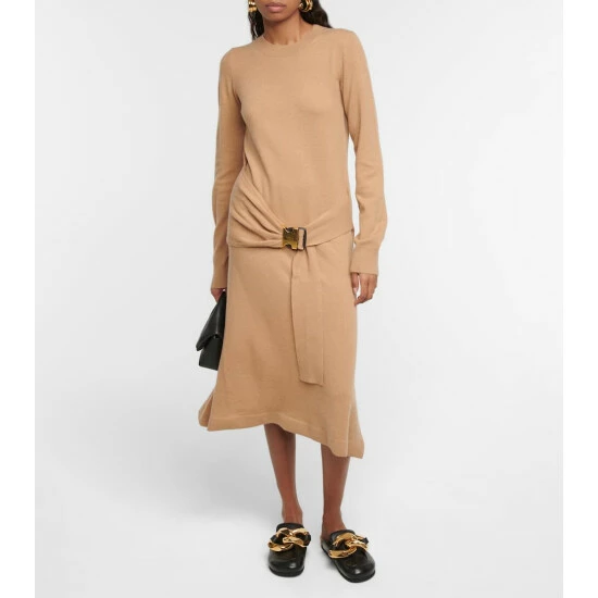 First introduced on the FW20 runway, exaggerated curb chains have become a JW Anderson signature. The motif appears in polished gold-tone hardware to the dropped waist of this merino wool midi dress.