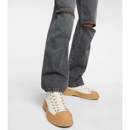 These high-top sneakers from JW Anderson sit atop a chunky ribbed rubber sole and are made from canvas with the signature anchor emblem that presents the designer’s initials in a manner that’s at once humorous and humble.
