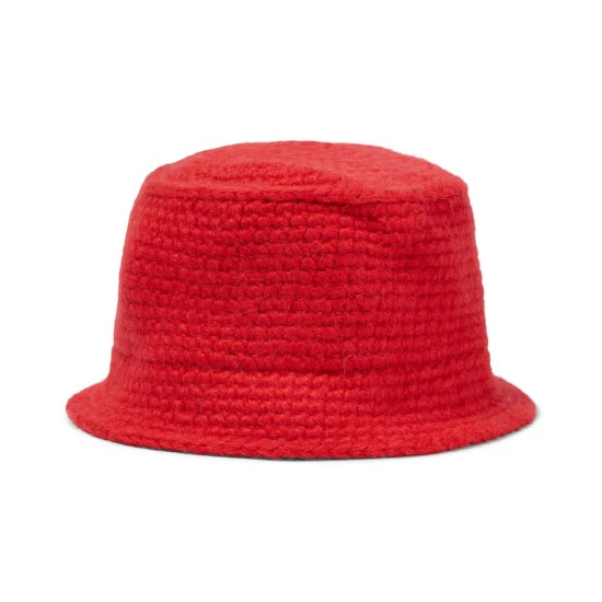 JW Anderson reworks the bucket hat in a knitted crochet construction made from an alpaca wool blend. This hat has a short brim and features a leather patch with an embossed logo.