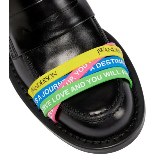 JW Anderson adds intrigue to traditional leather loafers with colorful elasticated slogan and logo straps at the toecaps. Note the tactile linings for comfortable wear.
