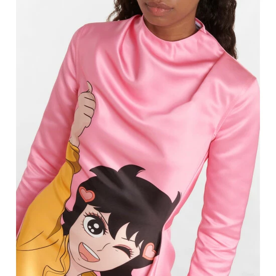 JW Anderson offers fashion inspired by the Korean anime ‘Run Hany’. This style features a print of the main character on a flared silhouette with long sleeves, a cowl neck, and fitted waist.