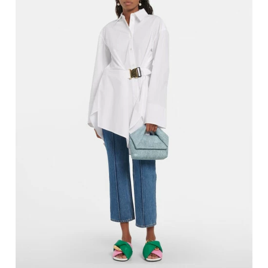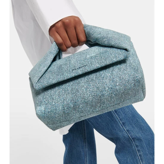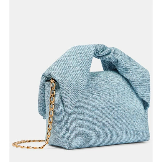 JW Anderson’s Twister shoulder bag is defined by its distinctive twisted top handle. Made from denim-inspired blue leather, it has a detachable chain shoulder strap and a foldover top with magnetic fastenings.