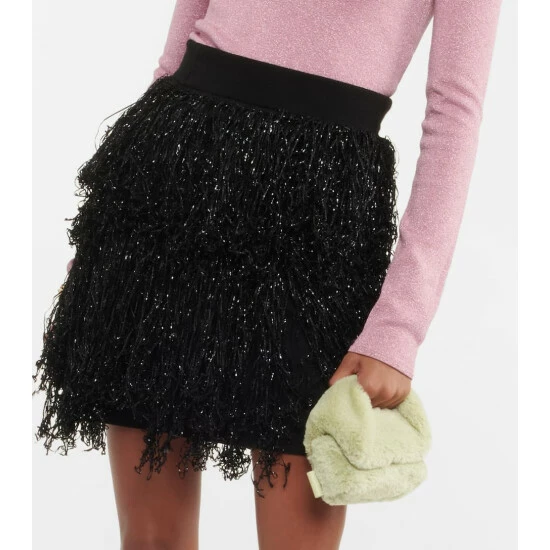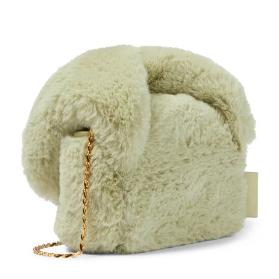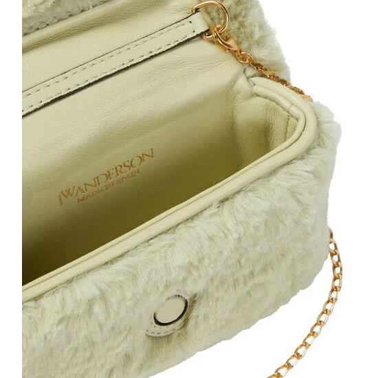 The Twister Mini crossbody bag from JW Anderson features the collection’s signature twisted top handle. This style has all-over faux fur detailing, an inner leather pocket, and a detachable gold chain.