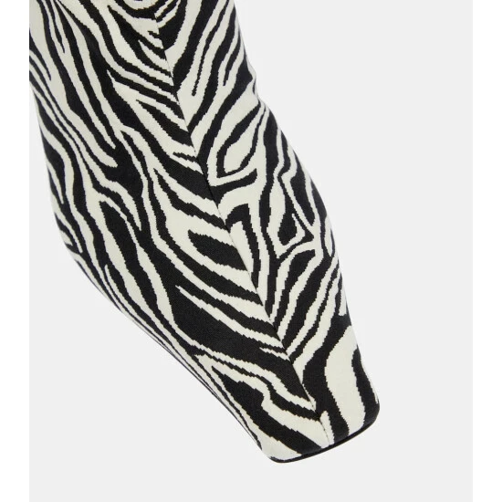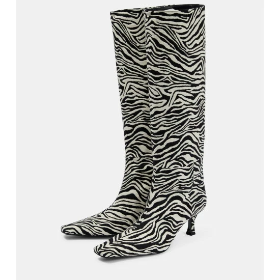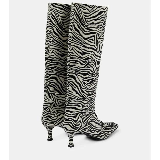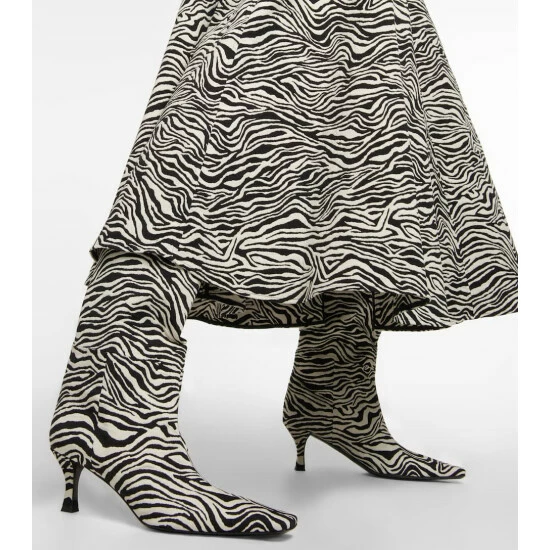The Trap knee-high boots from Proenza Schouler are made in Italy in a loose-fitting style. The cotton-blend uppers feature an all-over zebra pattern, fluted high heels, and trapezoid-shaped toes.