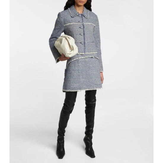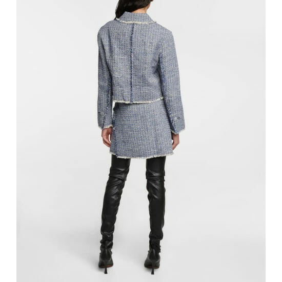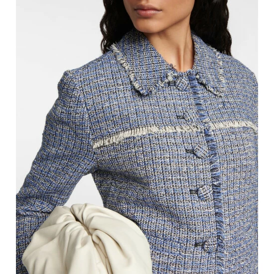 This cropped tweed jacket from Proenza Schouler’s White Label line combines old-school sophistication with a modern, boxy silhouette. The frayed trims at the collar, cuffs, and hem add textural interest to the design.