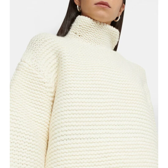 This sweater from Proenza Schouler’s White Label is made from wool and alpaca-blend yarns in a chunky knit. It has a wide turtleneck and an oversized silhouette with dropped shoulders.